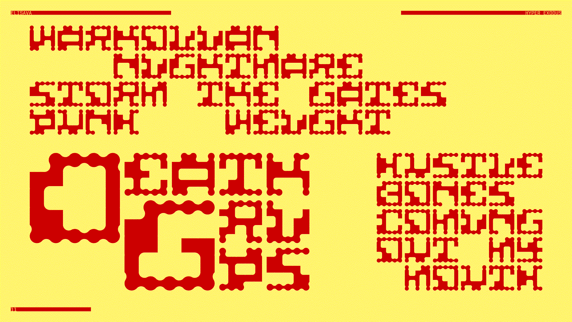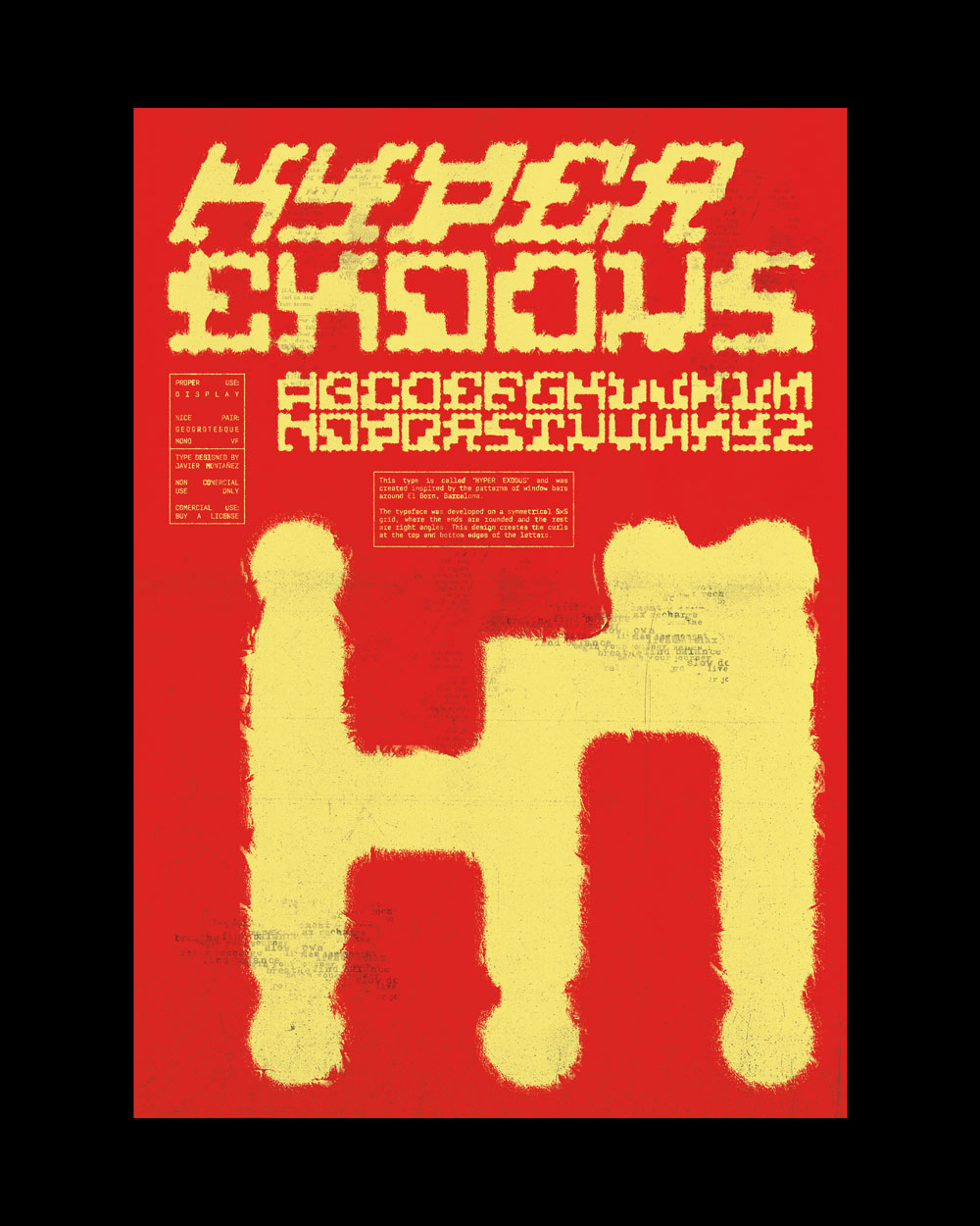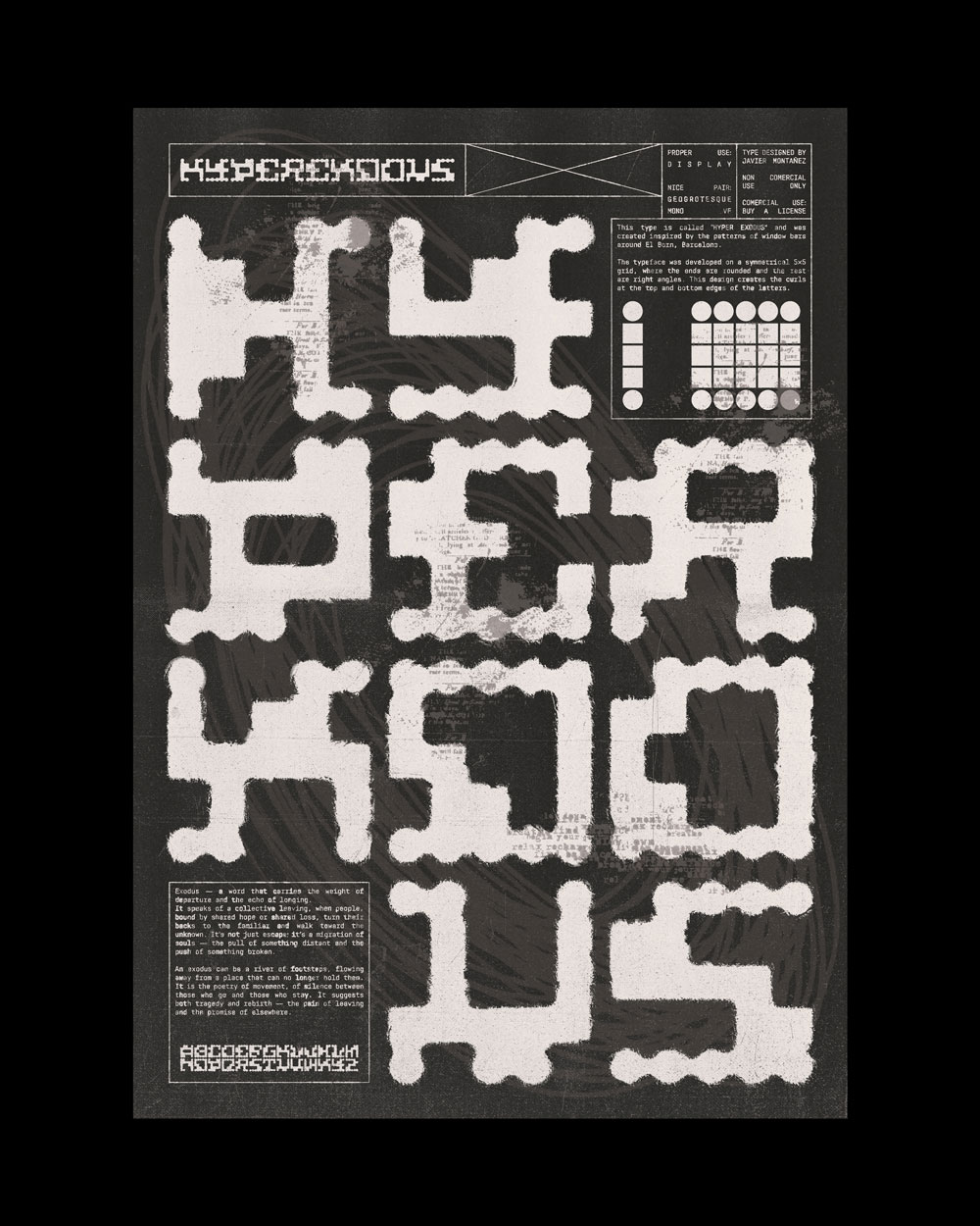 This typeface is inspired by an iron gate in the Gothic Quarter of Barcelona. I liked the contrast between the curves and the strict vertical bars, so I decided to build the whole type system from that idea.